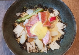 Royale of asparagus and its roasted red mullet combined with the crumble of olives and the parmesan flirts with the Mediterranean.