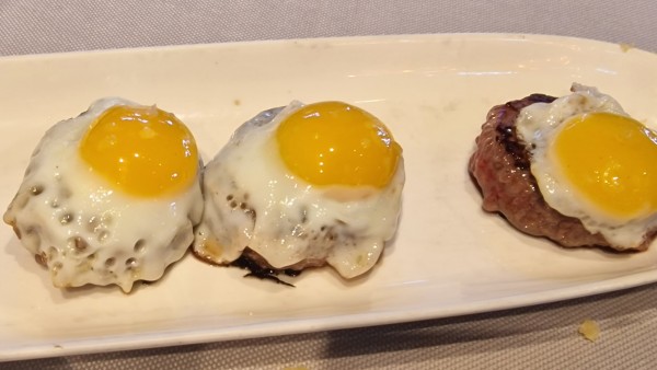 red partridge meat , wagyu tartare, wagyu burger, mini wagyu burgers topped with red partridge eggs: