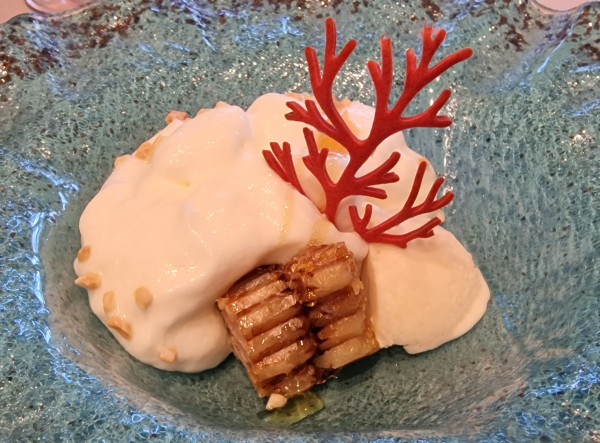 Nest of bees, shortcrust pastry coral, whipped egg white rock with vanilla and honey flavour.