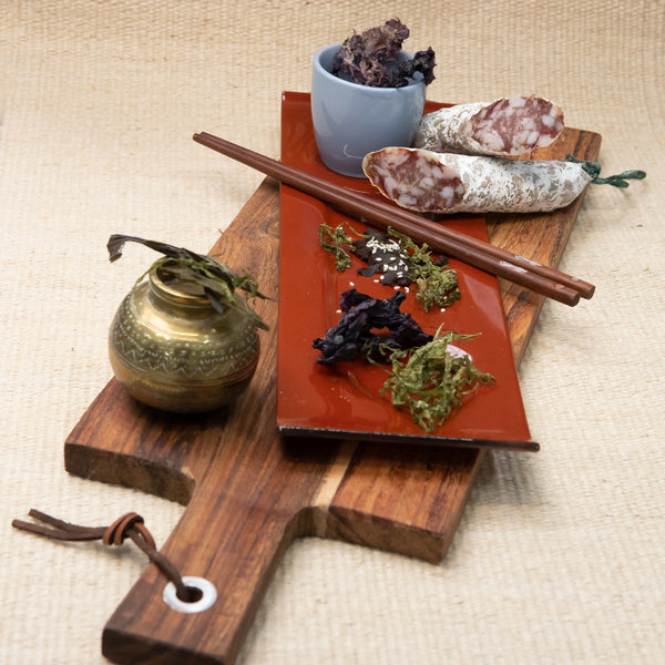 A daring fusion between East and West: savory miso meets briny seaweed, balanced with our aged, dry sausage. Earthy, umami-rich, and surprisingly harmonious—every slice is a voyage across flavor oceans.