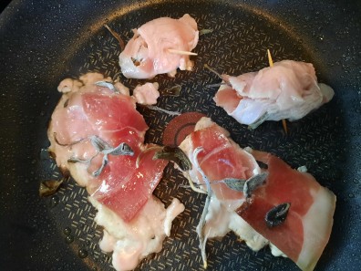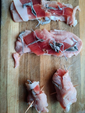 2) Place a slice of raw ham and a sage leaf on each slice of meat, then stop it all with a toothpick.