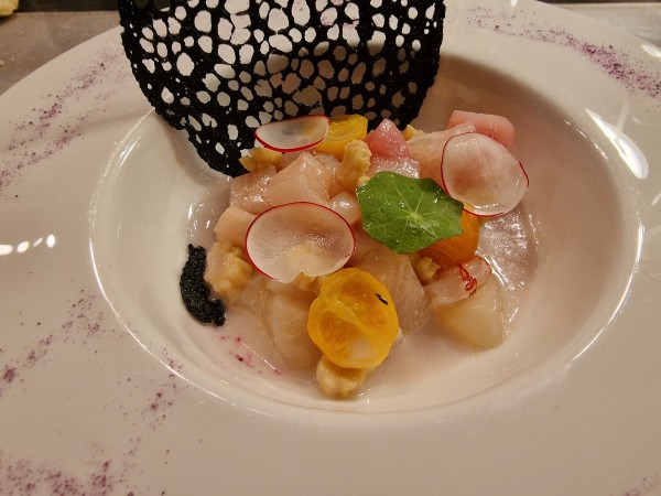 Pomegranate ceviche, scallops, prawns, amberjack, yellow cherry tomatoes, baby corn on the cob and radishes