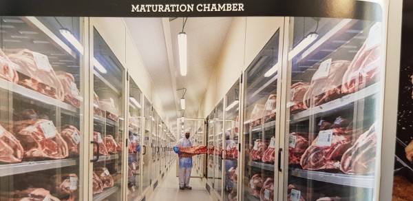 It reminds me a lot of the individual maturation chamber with temperature and humidity control located in the "Finca Santa Rosalia" in Vismalo-Burgos, a great producer of Iberian-Japanese crossbreed wagyu beef. Here it is with some of the products displayed here at Sirha in the Burgos - Region Castillana stand.